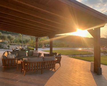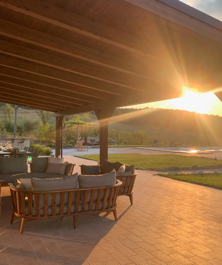 The back of the property features a large tiled terrace with a wooden pergola, offering a comfortable dining and lounge area. From here, you can enjoy views of Todi and the surrounding countryside. This space is perfect for alfresco meals and sunset aperitivos.